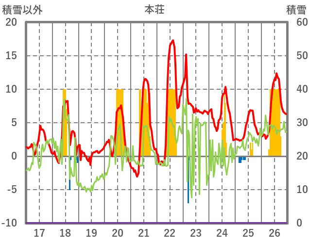 | 日 | 時 | 気温 | 降水 | 風向/風速 | 日照 | 積雪 | 降雪 |