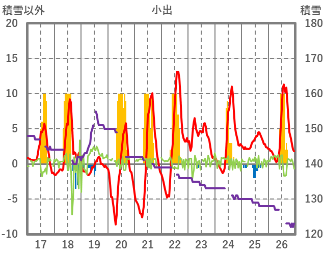 | 日 | 時 | 気温 | 降水 | 風向/風速 | 日照 | 積雪 | 降雪 |