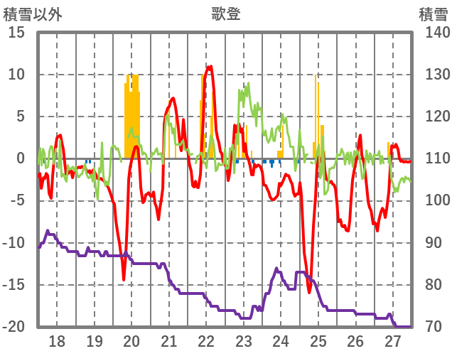 | 日 | 時 | 気温 | 降水 | 風向/風速 | 日照 | 積雪 | 降雪 |
