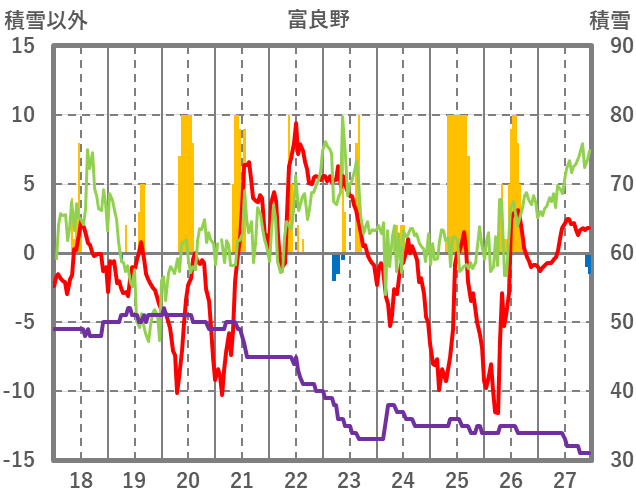 | 日 | 時 | 気温 | 降水 | 風向/風速 | 日照 | 積雪 | 降雪 |