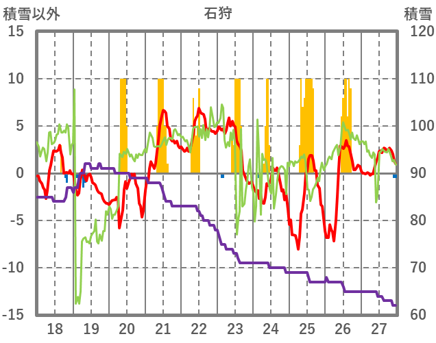| 日 | 時 | 気温 | 降水 | 風向/風速 | 日照 | 積雪 | 降雪 |
