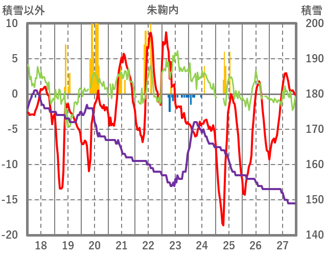 | 日 | 時 | 気温 | 降水 | 風向/風速 | 日照 | 積雪 | 降雪 |