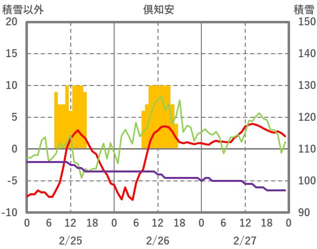 | 日 | 時 | 気温 | 降水 | 風向/風速 | 日照 | 積雪 | 降雪 |
