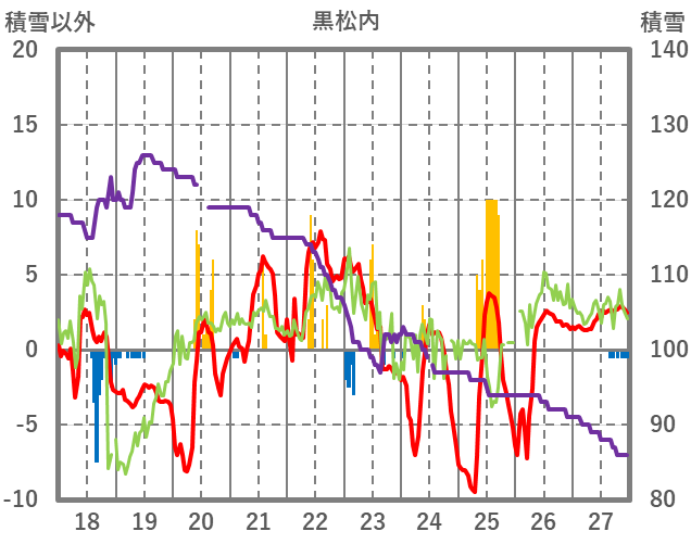 | 日 | 時 | 気温 | 降水 | 風向/風速 | 日照 | 積雪 | 降雪 |
