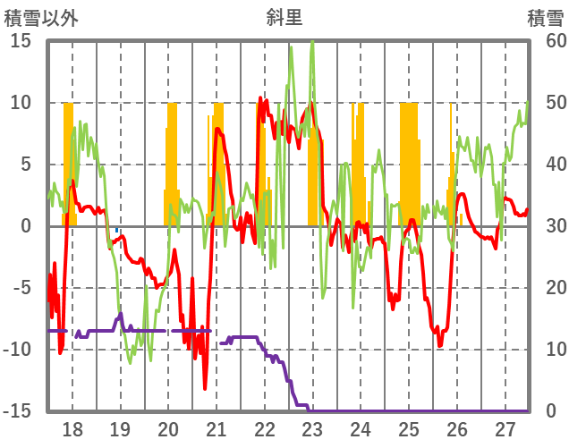 | 日 | 時 | 気温 | 降水 | 風向/風速 | 日照 | 積雪 | 降雪 |