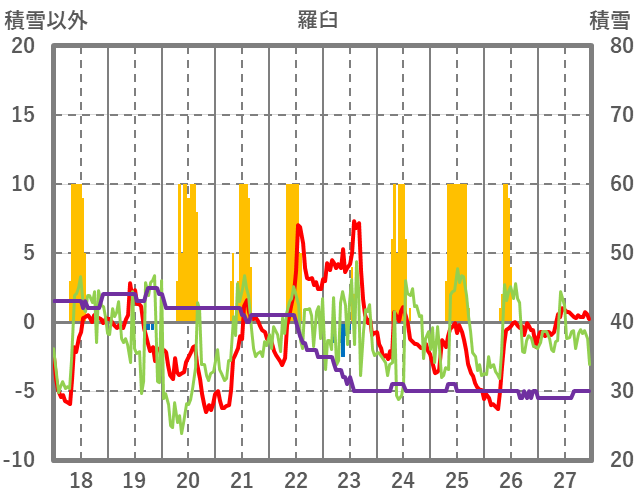 | 日 | 時 | 気温 | 降水 | 風向/風速 | 日照 | 積雪 | 降雪 |