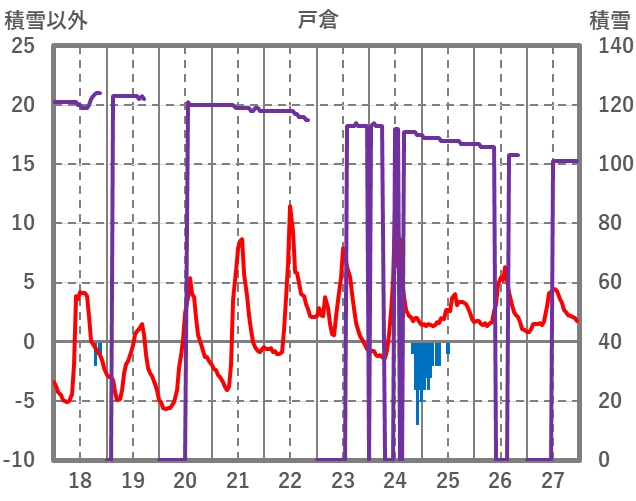 | 日 | 時 | 気温 | 降水 | 風向/風速 | 日照 | 積雪 | 降雪 |