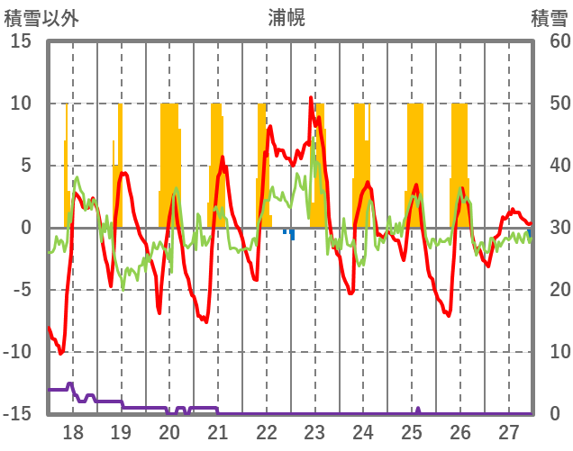 | 日 | 時 | 気温 | 降水 | 風向/風速 | 日照 | 積雪 | 降雪 |