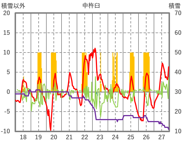 | 日 | 時 | 気温 | 降水 | 風向/風速 | 日照 | 積雪 | 降雪 |