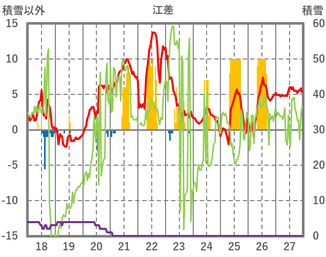 | 日 | 時 | 気温 | 降水 | 風向/風速 | 日照 | 積雪 | 降雪 |