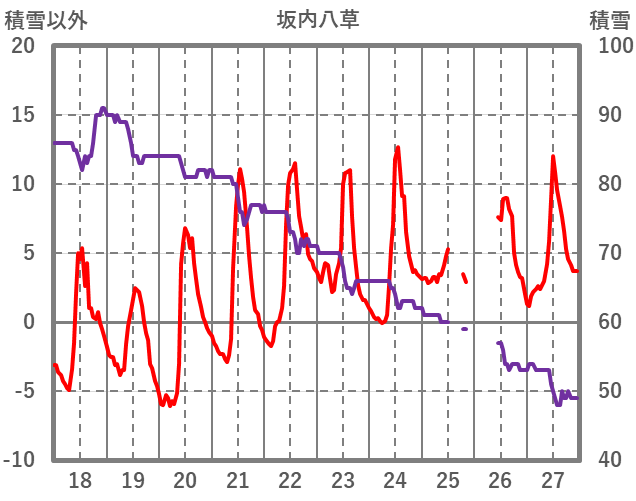 | 日 | 時 | 気温 | 降水 | 風向/風速 | 日照 | 積雪 | 降雪 |