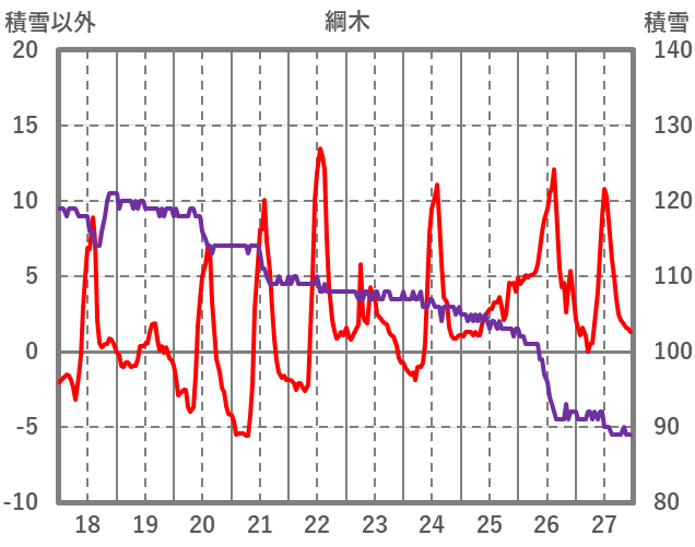 | 日 | 時 | 気温 | 降水 | 風向/風速 | 日照 | 積雪 | 降雪 |
