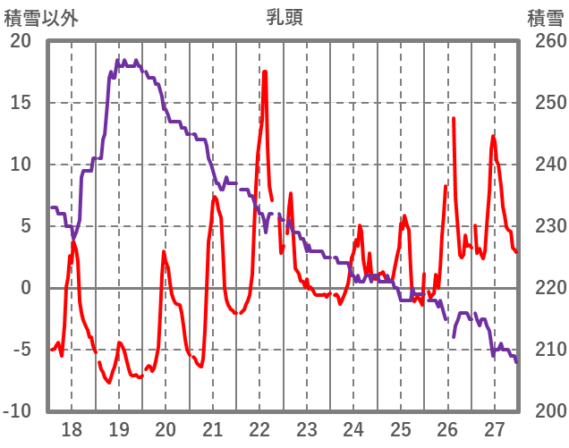 | 日 | 時 | 気温 | 降水 | 風向/風速 | 日照 | 積雪 | 降雪 |