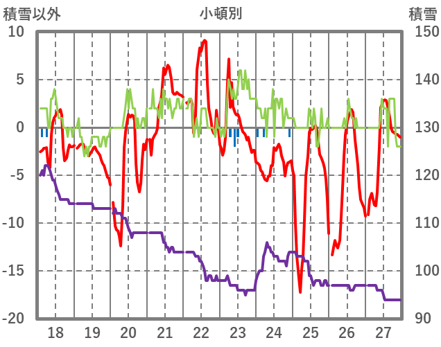 | 日 | 時 | 気温 | 降水 | 風向/風速 | 日照 | 積雪 | 降雪 |