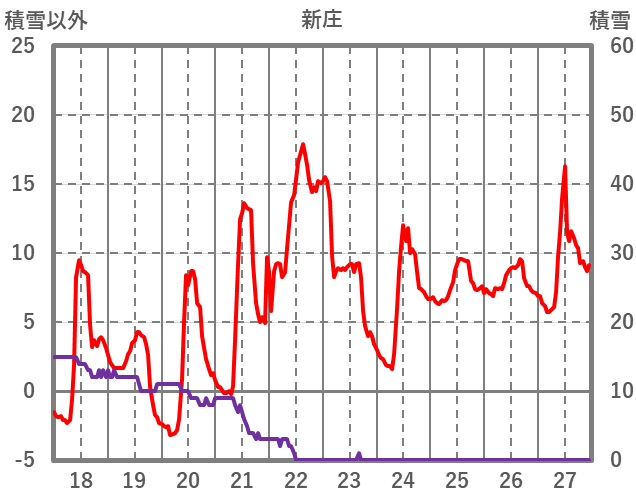| 日 | 時 | 気温 | 降水 | 風向/風速 | 日照 | 積雪 | 降雪 |