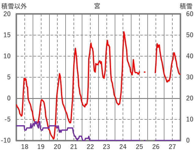 | 日 | 時 | 気温 | 降水 | 風向/風速 | 日照 | 積雪 | 降雪 |