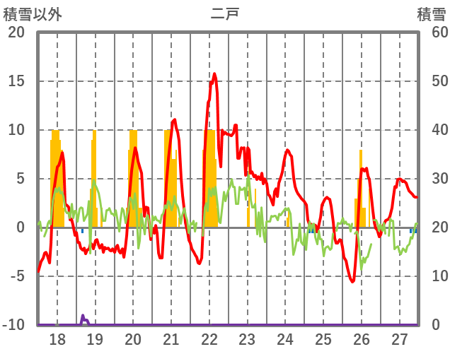 | 日 | 時 | 気温 | 降水 | 風向/風速 | 日照 | 積雪 | 降雪 |