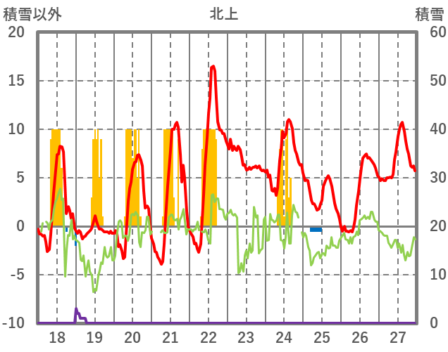 | 日 | 時 | 気温 | 降水 | 風向/風速 | 日照 | 積雪 | 降雪 |