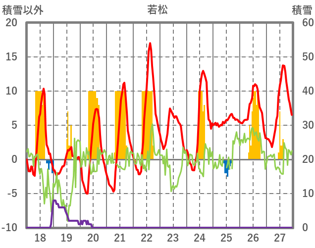 | 日 | 時 | 気温 | 降水 | 風向/風速 | 日照 | 積雪 | 降雪 |