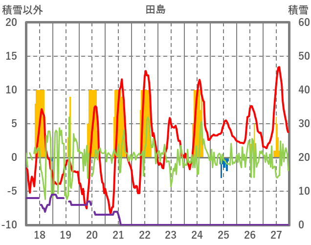 | 日 | 時 | 気温 | 降水 | 風向/風速 | 日照 | 積雪 | 降雪 |