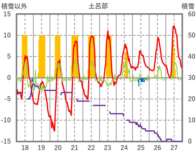 | 日 | 時 | 気温 | 降水 | 風向/風速 | 日照 | 積雪 | 降雪 |