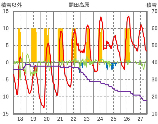 | 日 | 時 | 気温 | 降水 | 風向/風速 | 日照 | 積雪 | 降雪 |