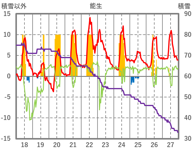 | 日 | 時 | 気温 | 降水 | 風向/風速 | 日照 | 積雪 | 降雪 |