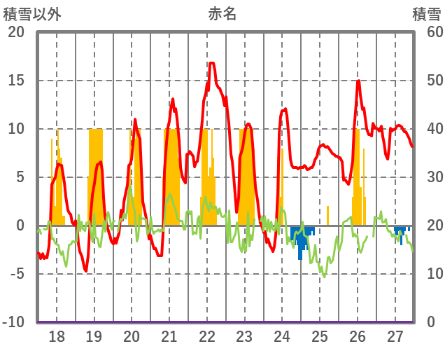 | 日 | 時 | 気温 | 降水 | 風向/風速 | 日照 | 積雪 | 降雪 |