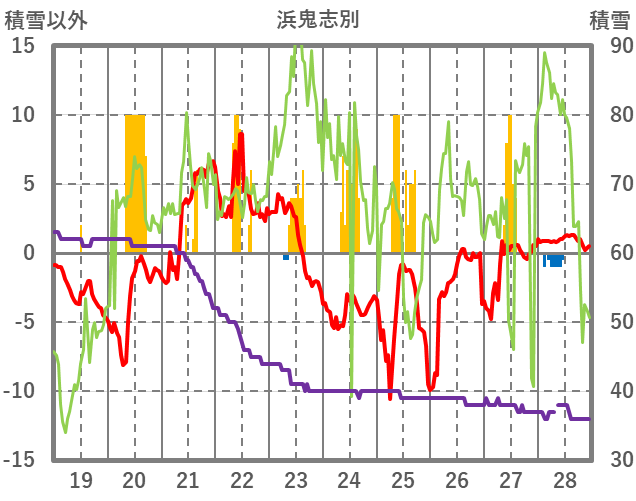 | 日 | 時 | 気温 | 降水 | 風向/風速 | 日照 | 積雪 | 降雪 |