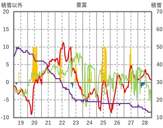 | 日 | 時 | 気温 | 降水 | 風向/風速 | 日照 | 積雪 | 降雪 |