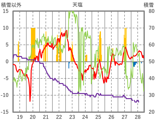 | 日 | 時 | 気温 | 降水 | 風向/風速 | 日照 | 積雪 | 降雪 |