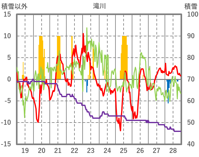 | 日 | 時 | 気温 | 降水 | 風向/風速 | 日照 | 積雪 | 降雪 |