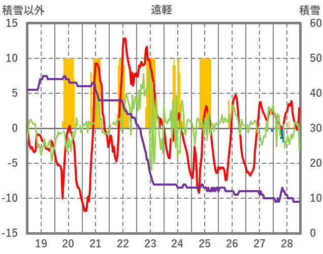 | 日 | 時 | 気温 | 降水 | 風向/風速 | 日照 | 積雪 | 降雪 |