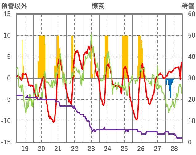 | 日 | 時 | 気温 | 降水 | 風向/風速 | 日照 | 積雪 | 降雪 |