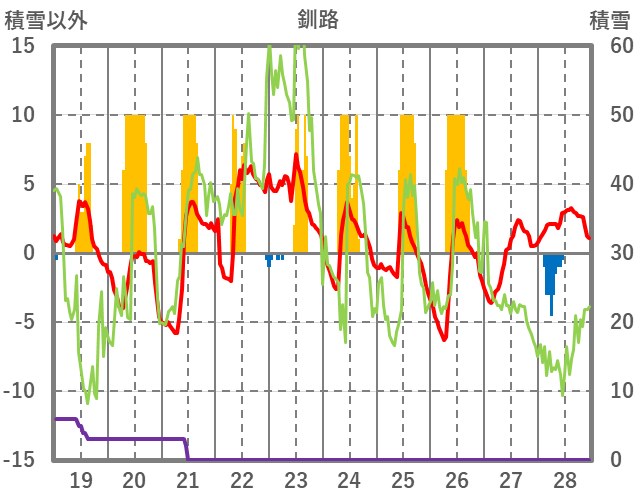| 日 | 時 | 気温 | 降水 | 風向/風速 | 日照 | 積雪 | 降雪 |