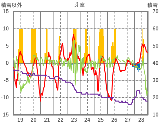 | 日 | 時 | 気温 | 降水 | 風向/風速 | 日照 | 積雪 | 降雪 |