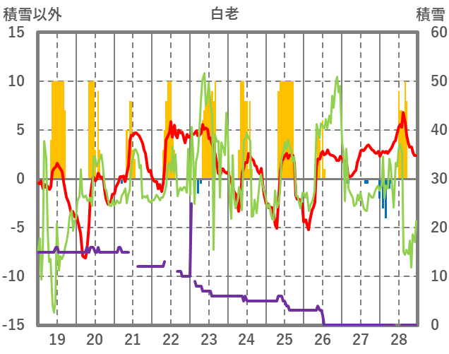 | 日 | 時 | 気温 | 降水 | 風向/風速 | 日照 | 積雪 | 降雪 |