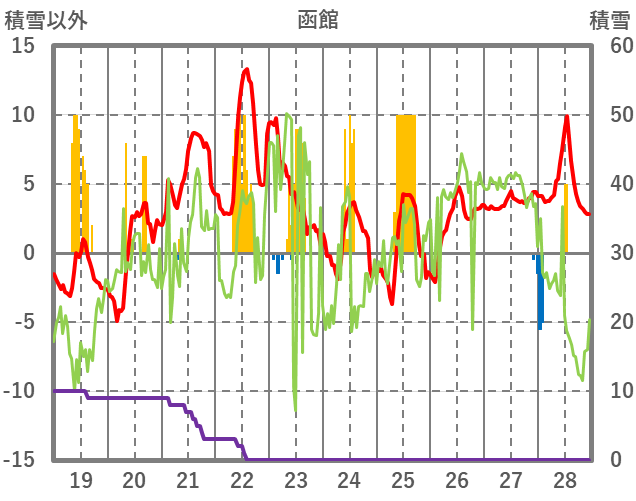| 日 | 時 | 気温 | 降水 | 風向/風速 | 日照 | 積雪 | 降雪 |