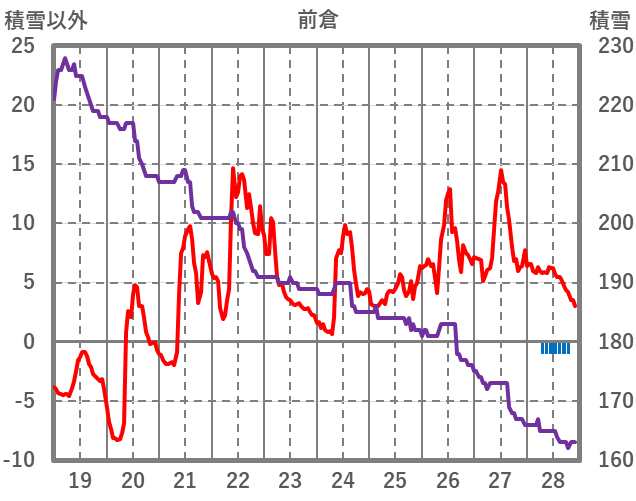 | 日 | 時 | 気温 | 降水 | 風向/風速 | 日照 | 積雪 | 降雪 |