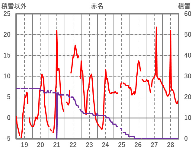 | 日 | 時 | 気温 | 降水 | 風向/風速 | 日照 | 積雪 | 降雪 |