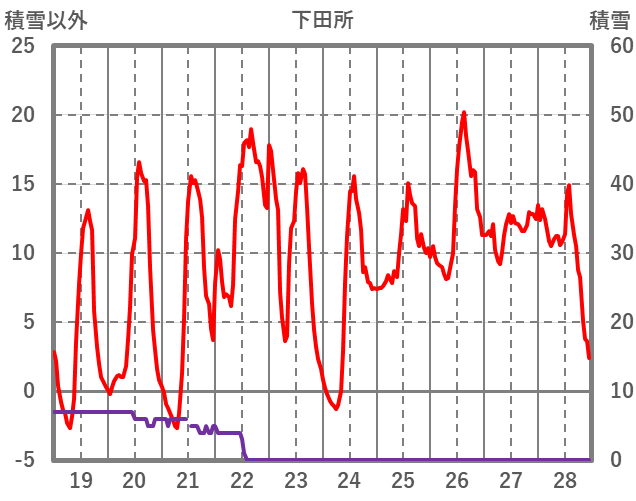 | 日 | 時 | 気温 | 降水 | 風向/風速 | 日照 | 積雪 | 降雪 |
