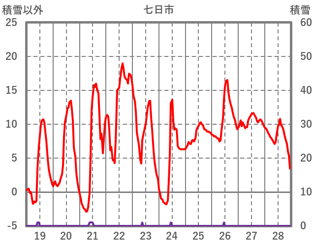 | 日 | 時 | 気温 | 降水 | 風向/風速 | 日照 | 積雪 | 降雪 |