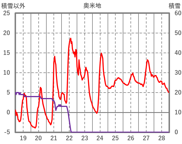 | 日 | 時 | 気温 | 降水 | 風向/風速 | 日照 | 積雪 | 降雪 |
