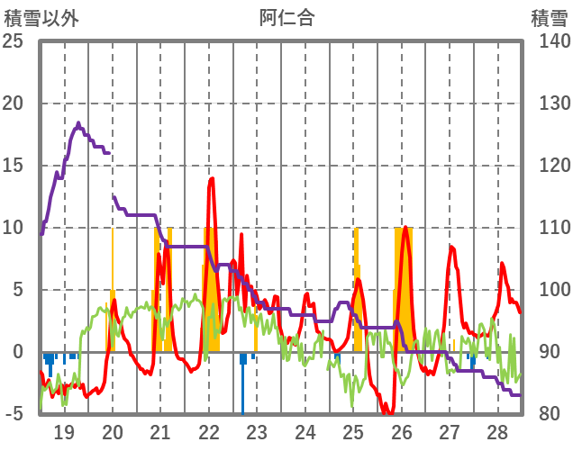 | 日 | 時 | 気温 | 降水 | 風向/風速 | 日照 | 積雪 | 降雪 |