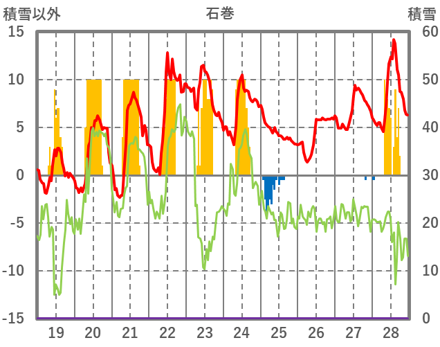 | 日 | 時 | 気温 | 降水 | 風向/風速 | 日照 | 積雪 | 降雪 |