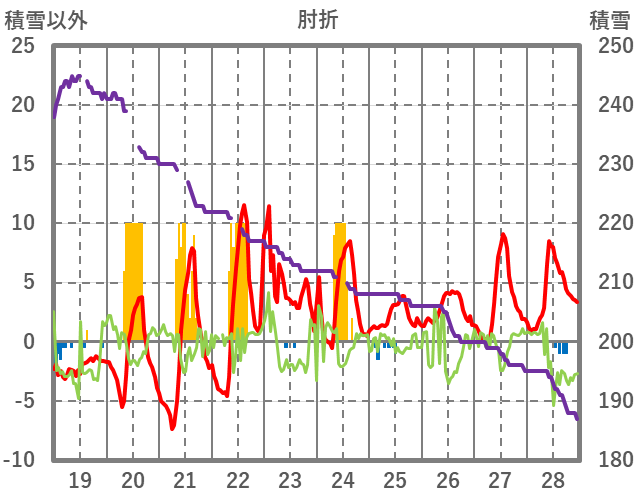 | 日 | 時 | 気温 | 降水 | 風向/風速 | 日照 | 積雪 | 降雪 |