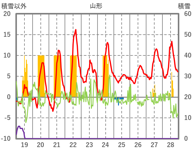 | 日 | 時 | 気温 | 降水 | 風向/風速 | 日照 | 積雪 | 降雪 |