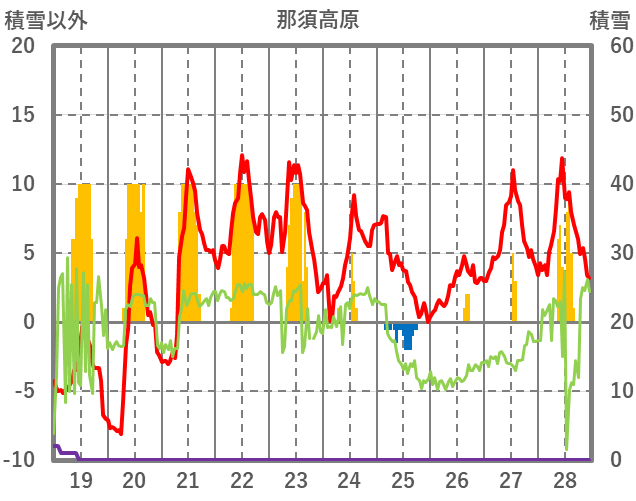 | 日 | 時 | 気温 | 降水 | 風向/風速 | 日照 | 積雪 | 降雪 |