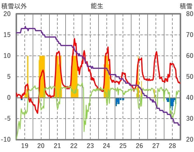 | 日 | 時 | 気温 | 降水 | 風向/風速 | 日照 | 積雪 | 降雪 |