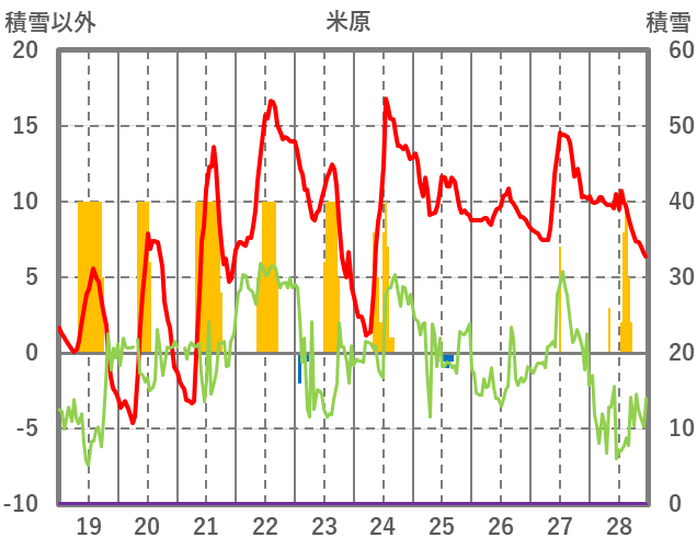 | 日 | 時 | 気温 | 降水 | 風向/風速 | 日照 | 積雪 | 降雪 |